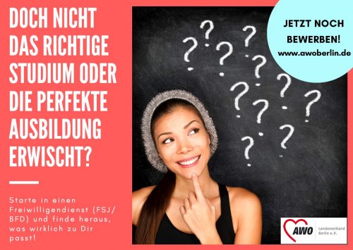 Der AWO Landesverband Berlin e.V. bietet seit vielen Jahren das Freiwillige Soziale Jahr (FSJ) und den Bundesfreiwilligendienst (BFD) an. Wir vermitteln Plätze in Berlin und Brandenburg und begleiten die Freiwilligen während ihres Dienstes. Wir sind einer der größten Träger für Freiwilligendienste in Berlin.